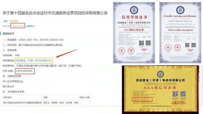 一、項目編號:GWZC-2021-150、XACHZC-XA2021-063 二、項目名稱:第十四屆全運會全運村內交通服務運營項目 三、采購結果: 中標結果: 中標 供應商名稱:躍進紫金(天津)電動車有限公司 供應商地址:天津生態城動漫中路126號動漫大廈C區一層C3區(TG第189號) 中標 金額 : 4,655,000.00元